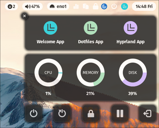 - Hyprland Settings: Opens the Hyprland Settings script to customize the look and feel, environment variables, monitor resolution, etc.